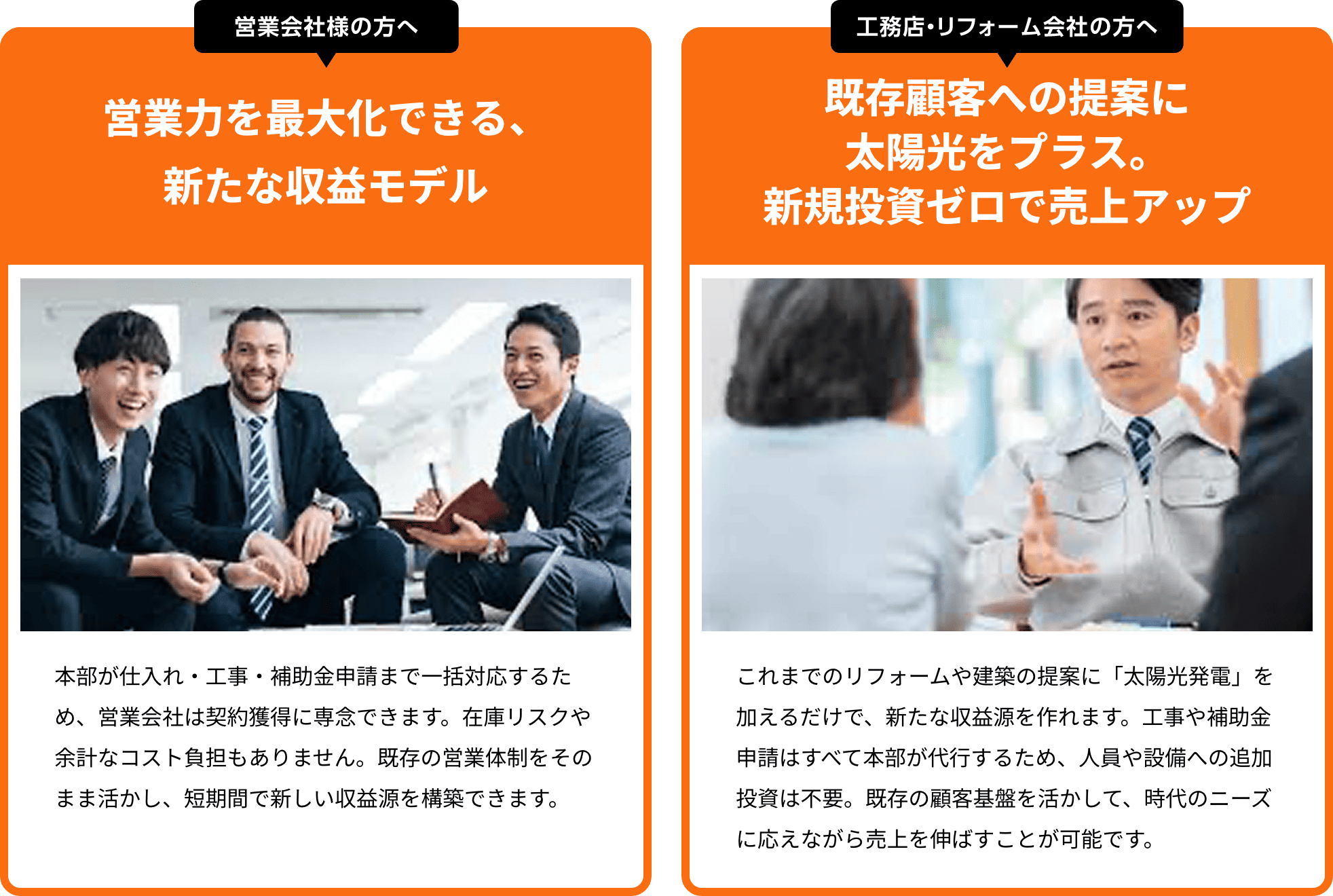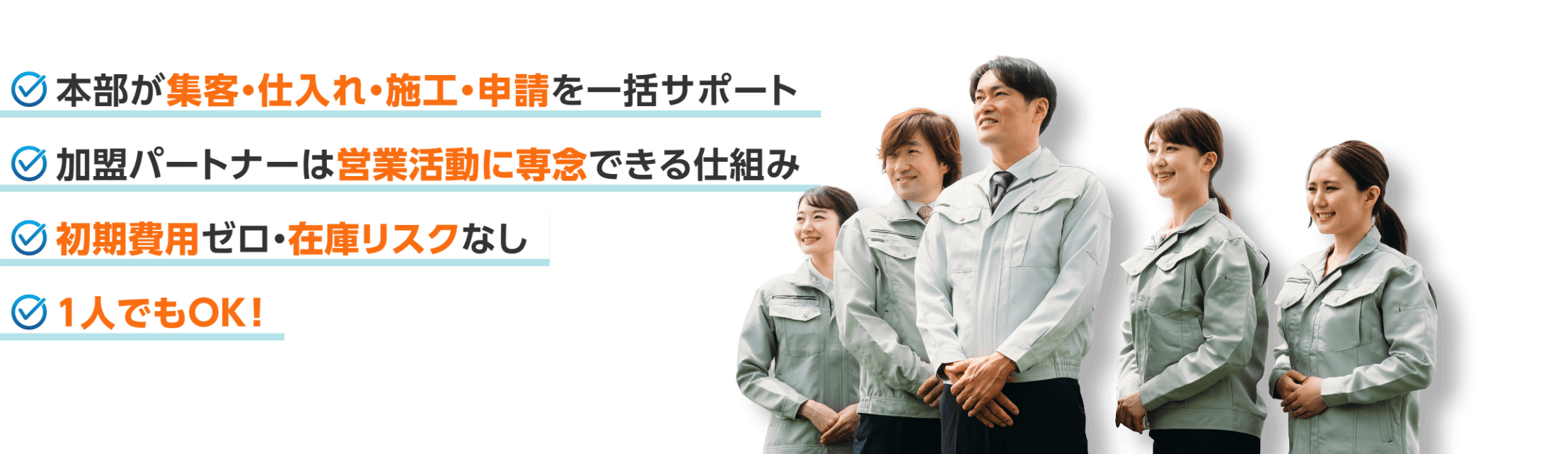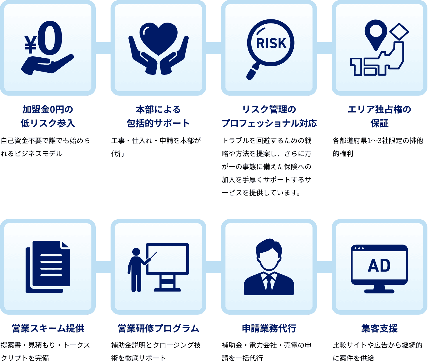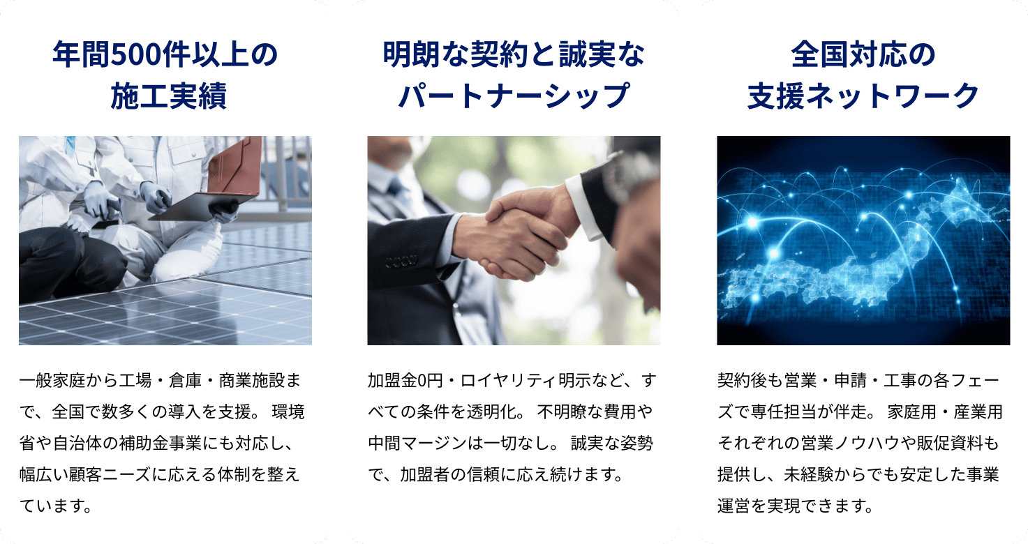 本部が営業研修や申請業務を代行します。提案書や見積もりも提供し、営業活動に専念できる環境を整えています。全力でサポートします。