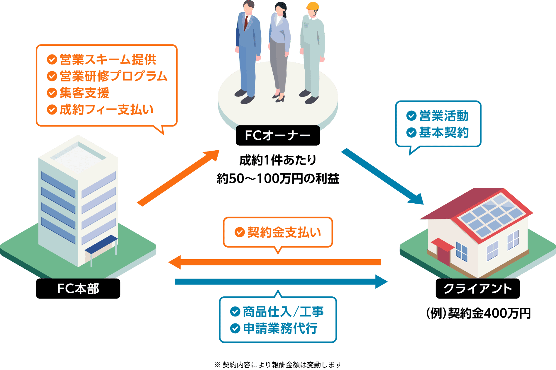 1件の成約で50〜100万円の収益が見込めます。契約金額に応じた収益シミュレーションも可能です。詳細はお問い合わせください。